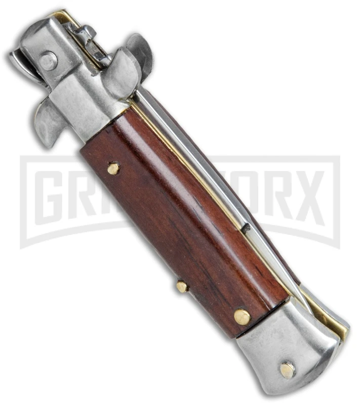This version of the SKM Stiletto is equipped with gonzo wood handle scales and a bayonet blade.
