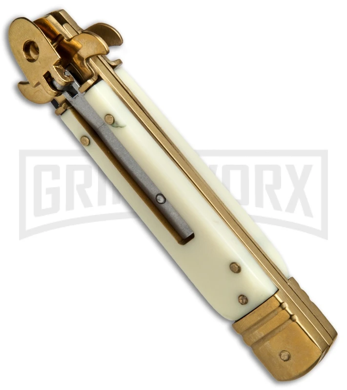 This 8″ Leverlock knife has a sim ivory handle and a black finished bayonet blade.