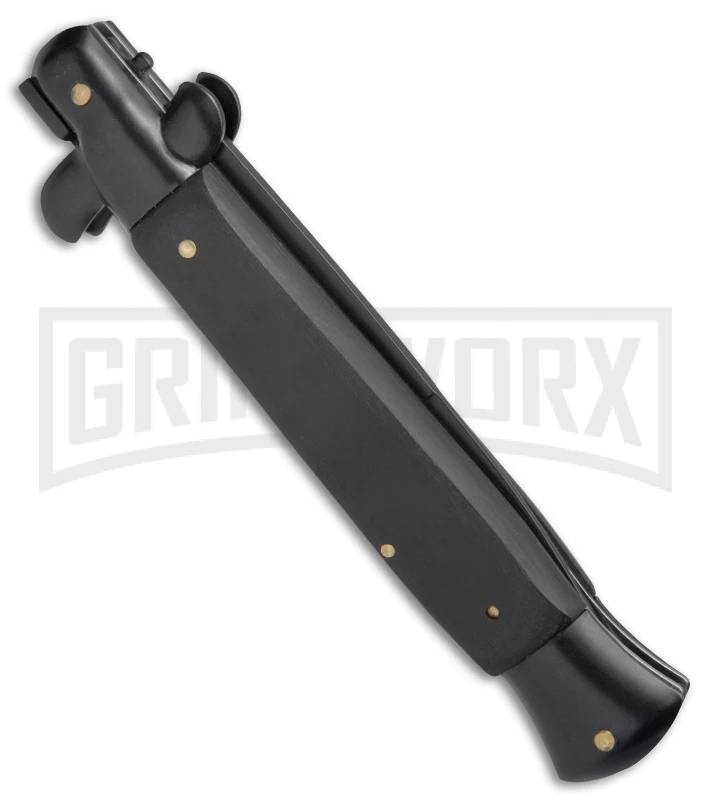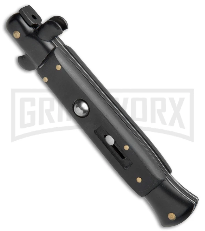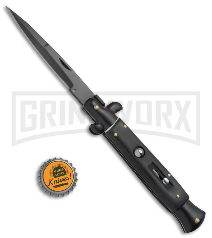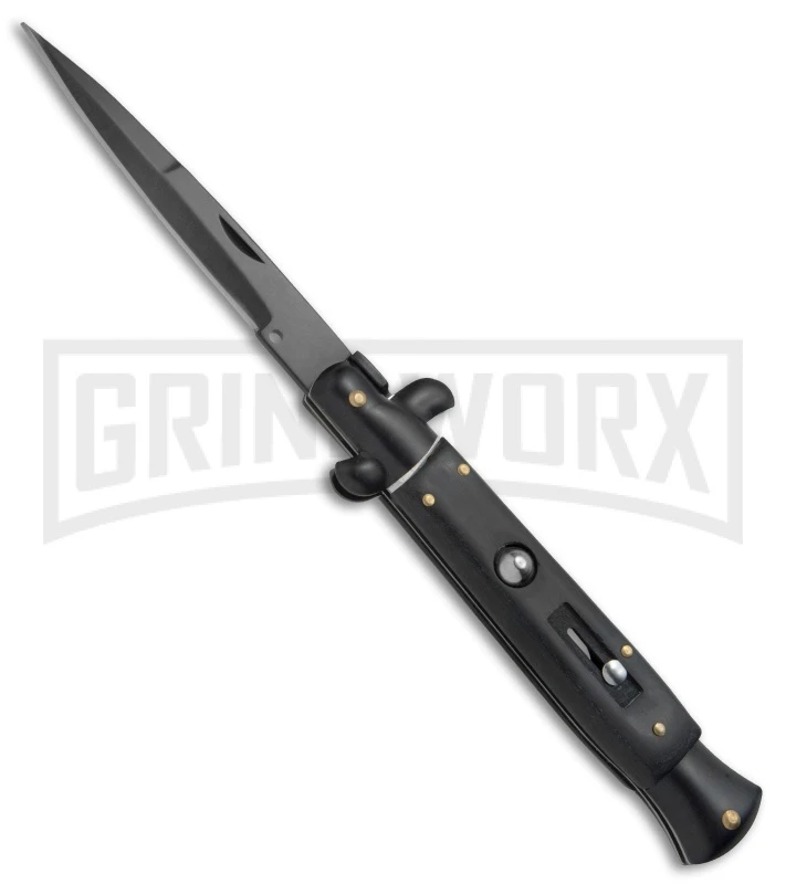 The Anomaly Stiletto offers an automatic Italian stiletto inspired design at an affordable price. It has a sim wood handle with an automatic push button and a sliding safety. The stainless steel blade comes in a bayonet style with a plain cutting edge. A swivel bolster locks the blade up tight and swivels forward to release. The Anomaly Stiletto provides a great introduction to the world of Italian style stiletto knives.