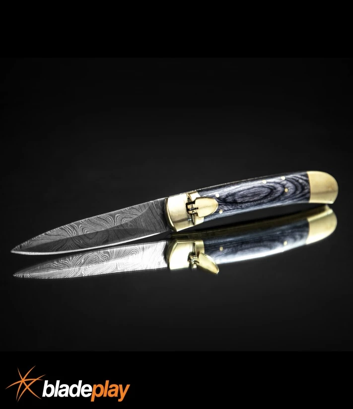This Leverlock model features a damascus dagger blade and a blackwood handle with brass bolsters. These handcrafted automatic knives are just like the fancy Italian leverlocks without the painful price tag! When you press the lever release the action is fast and the lock-up is solid. These have genuine dark wood handle scales with brass bolsters and file work along the spine. Add a great alternative to the Italian made Leverletto to your collection, at a great price.