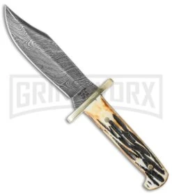 This Baby Bowie fixed blade from Bear and Son offers rugged USA-made quality and a compact EDC design. It comes equipped with a damascus bowie blade and an India stag horn handle.