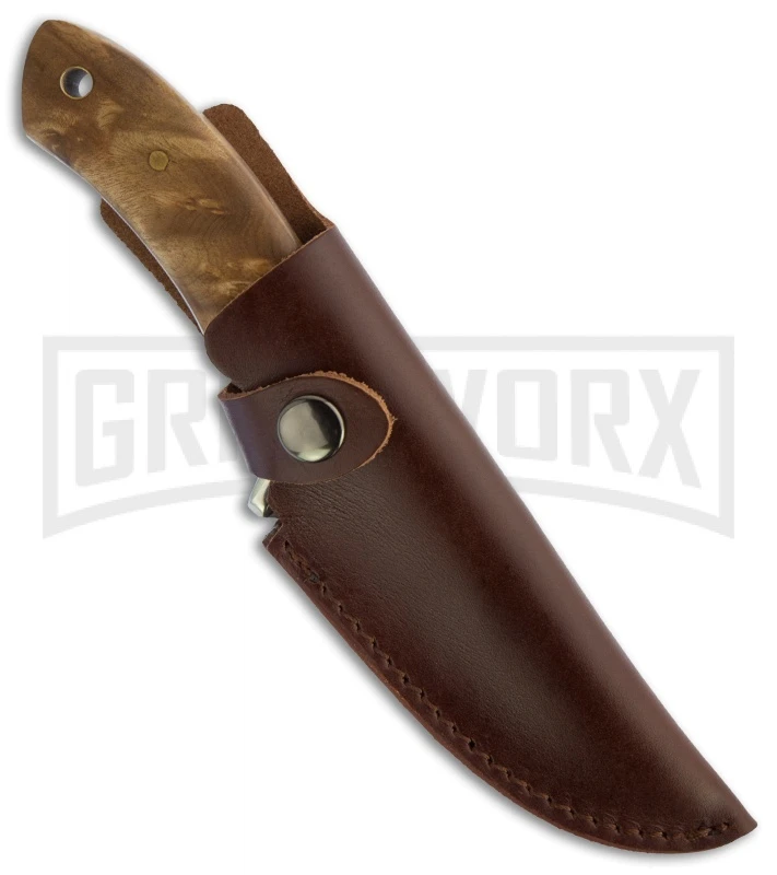 This Boker Magnum Macro Stubby Fixed Blade Knife boasts an elegant look while providing reliability and function. The wide blade, with a fine satin finish, is made of 440 stainless steel and is rock solid with its full tang construction and a thickness of 5/32″. The bellied drop point blade is hollow ground for optimal cutting efficiency. The brushed hand guard and selected burl wood scales make this an exquisite piece! Comes complete with lanyard hole and leather sheath.