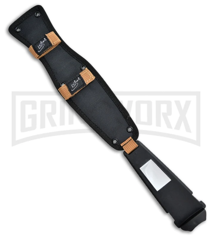 The Camillus Inuit is a fixed blade knife for all your tactical or hunting needs. The stainless steel, drop point blade has a black finish, fire starter notch, and a partially serrated edge. The handle is made of brown polymer with a knurled steel pommel and lanyard hole. It comes with a black hard ballistic nylon belt sheath with a signal mirror and fire starter.