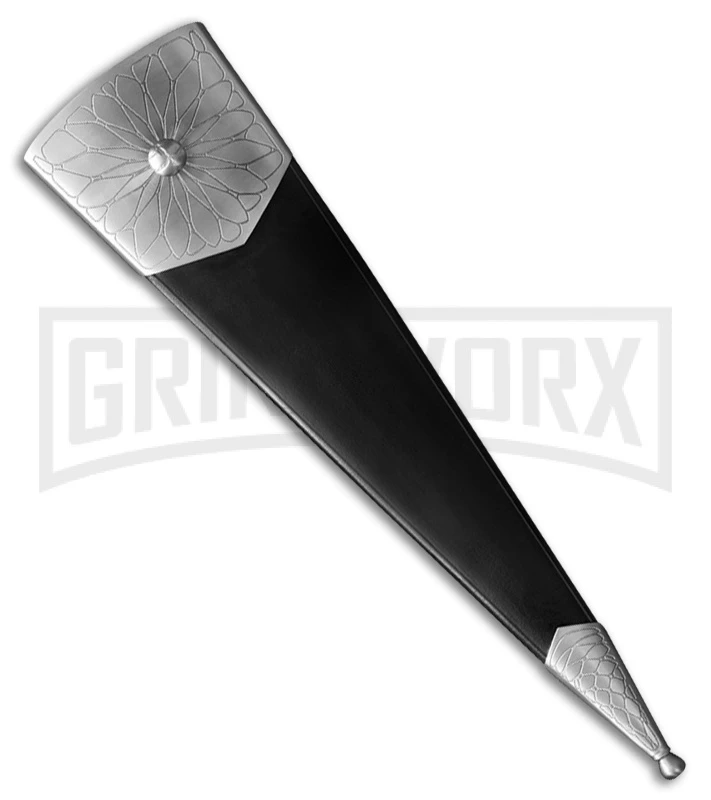 The Cold Steel Cinquedea is a large dagger with intricate detailing and extremely sharp edges. The Cinquedea features a satin finished, 1065 high carbon steel, dagger blade with dual cutting edges. The handle is crafted from Rosewood with a 6″ hand-carved grip, engraved stainless steel guard and pommel. Carry and attach using the leather scabbard with an engraved steel throat and chape.