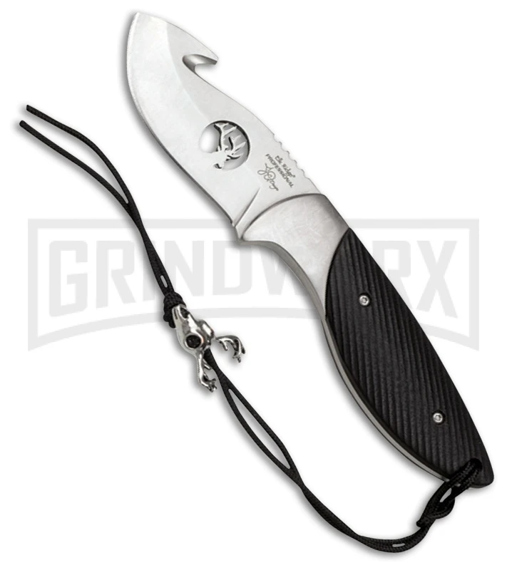 The Elk Ridge Professional Little Pursuer is a fixed blade knife for hunting or fishing. The gut hook blade is made out of 440C steel with a satin finish. It also has full tang construction for added strength. The handle is black G-10 with a stainless steel bolster. Includes a leather sheath and black lanyard with a deer skull bead.