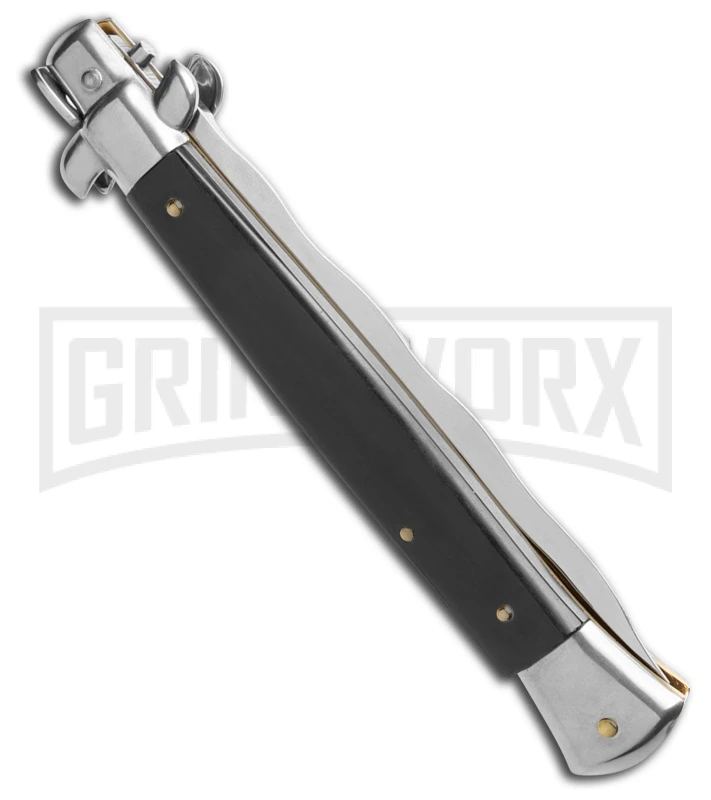 A beautiful classic, richly detailed and boasting of craftsmanship. The polished finished, kriss blade is a traditional style with a touch of the exotic. The brass pins and liners speaks to the tradition of Italian knife making as well as the quality of the materials. The push button release gives quick action, and the blade locks up solid. The sliding safety protects against accidental release. This piece is where you want to start your Italian stiletto collection.