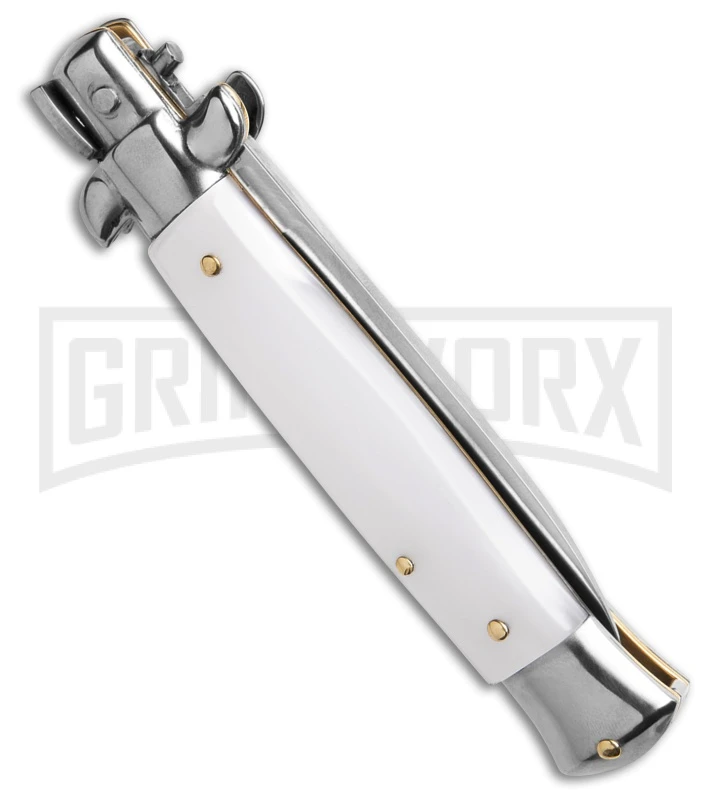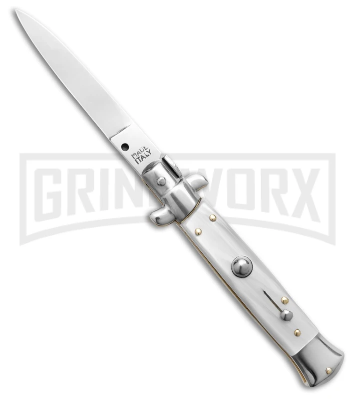 Beautiful, pearlex scales on the handle of this 8″ SKM stiletto give this knife a classic look. It has a stainless steel spear point blade and stainless steel bolsters. It also features brass liners and pins. The push value release has fast action and the lock-up is solid. The sliding safety protects against accidental release of the blade. This is a stunning addition to your Italian knife collection.