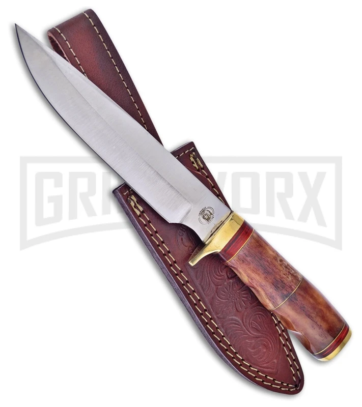 Skinning won’t be a problem while hunting with the Frost Cutlery Black Bear Bowie. This bowie features a satin finished, stainless steel, clip point blade. The handle is brown Pakkawood and bone with a brass guard and pommel. Easy accessibility and carry using the brown leather belt sheath.