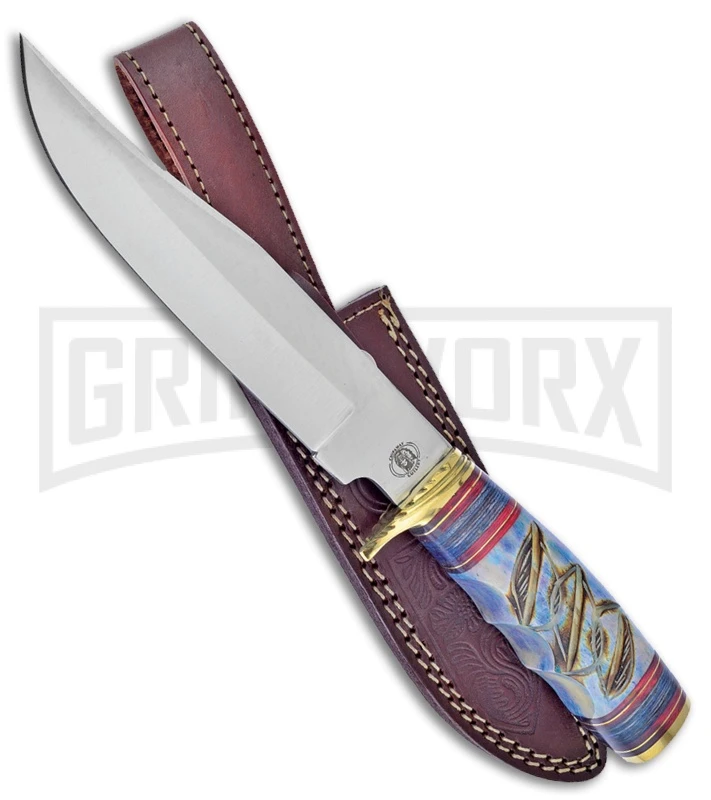 The Frost Cutlery Chipaway Eagle Hunter Bowie is a fixed blade knife for hunting. The stainless steel, clip point blade has a satin finish. The handle is made of blue bone and pakkawood that features a brass guard and pommel. It comes with a brown leather belt sheath.