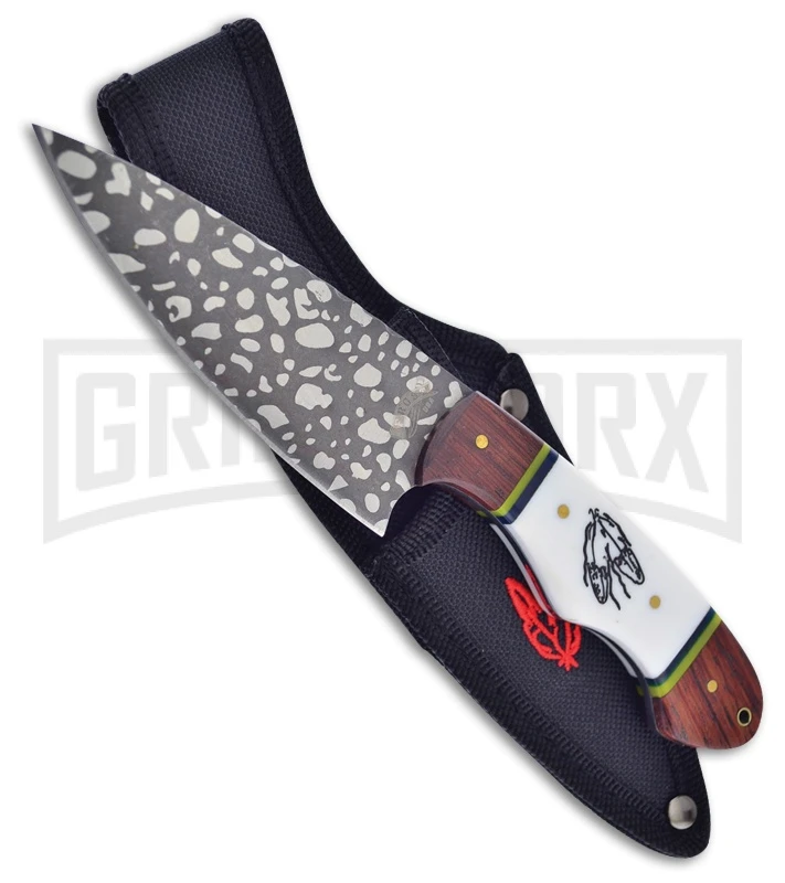 The Frost Cutlery Chipaway Feather is a fixed blade knife that is perfect for those weekends in the woods or when you are out hunting. The drop point blade is electrical finished stainless steel. The handle is crafted from wood with a ivorite handle insert with feather artwork and full tang. Carry this knife on your hip for easy accessibility with the black nylon belt sheath.