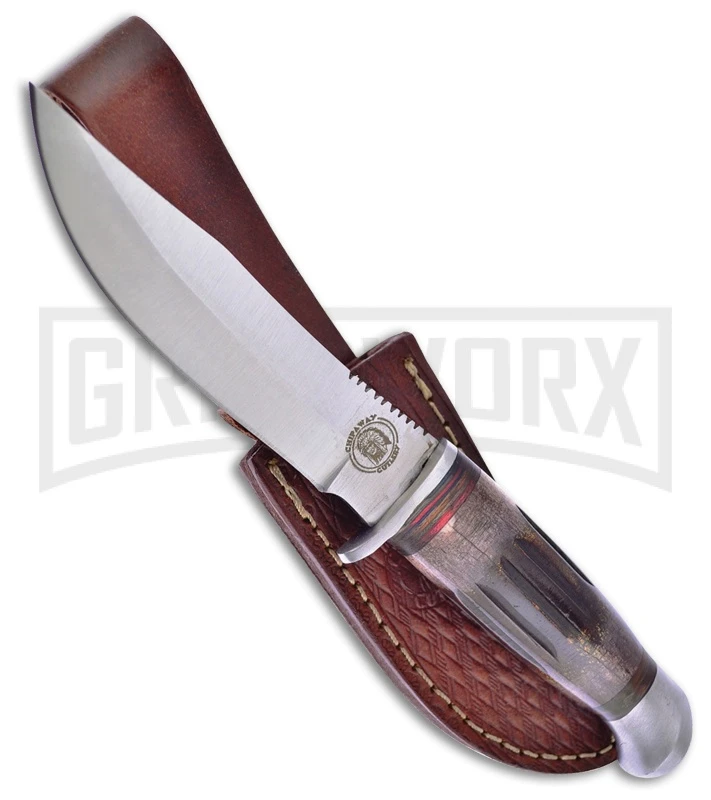The Frost Cutlery Chipaway Hunter is a fixed blade knife excellent for skinning that big buck, that trophy elk, or whatever you hunt. If you want a dependable skinning knife don’t look any further. This knife features a clip point style, stainless steel blade with a satin finish. The blade also has a thumb ridge with jimping. The handle is made of burnt bone with pakkawood spacers and stainless steel guard and pommel. It comes with a brown leather belt sheath.