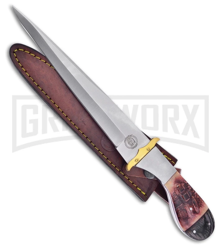 The Frost Cutlery Chipaway II is a fixed blade knife that is the perfect knife to add to your knife collection. The spear point blade is satin finished stainless steel. The handle is crafted from bone and Pakkawood with a brass guard. Carry the Chipaway II with the brown leather belt sheath that is included.