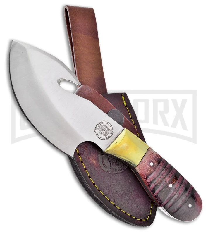 This Frost Cutlery Chipaway Montana fixed blade knife has a satin finished gut hook blade, brass guard, and a rounded brown bone handle. It includes a brown leather sheath for belt carry.