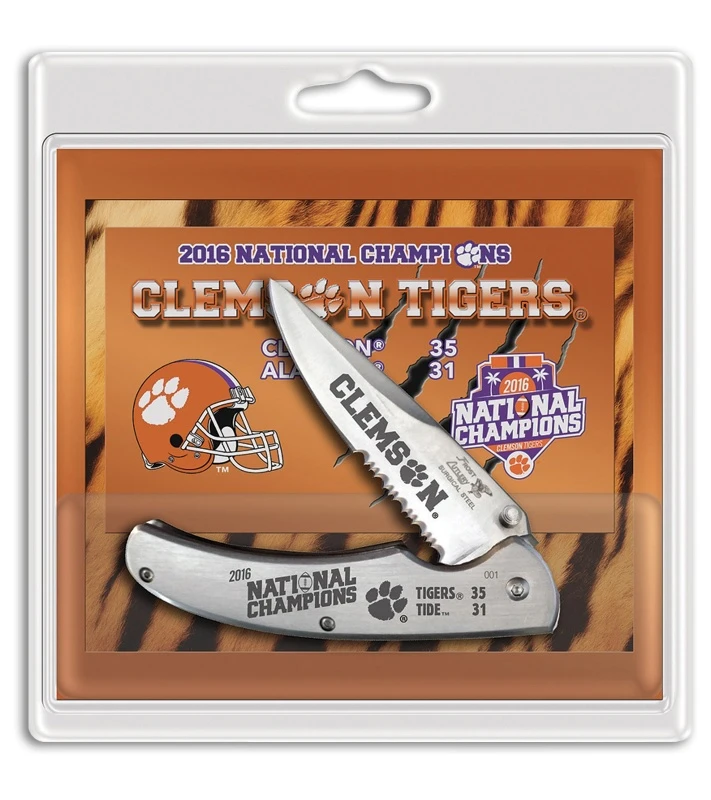 The Frost Cutlery Champs is a spring assisted knife that is perfect for those Clemson lovers. This knife is perfect for an everyday carry and gives you reason to bring out your knife to talk about how Clemson beat Alabama in the 2016 National Championship. The clip point blade is satin finished stainless steel with a flipper and thumb studs for opening. It also has a partially serrated edge. The blade is etched with the Clemson logo. The handle is a stainless steel frame lock with the National Championship artwork on the front of the handle. Keep this knife as your everyday carry by using the pocket clip.