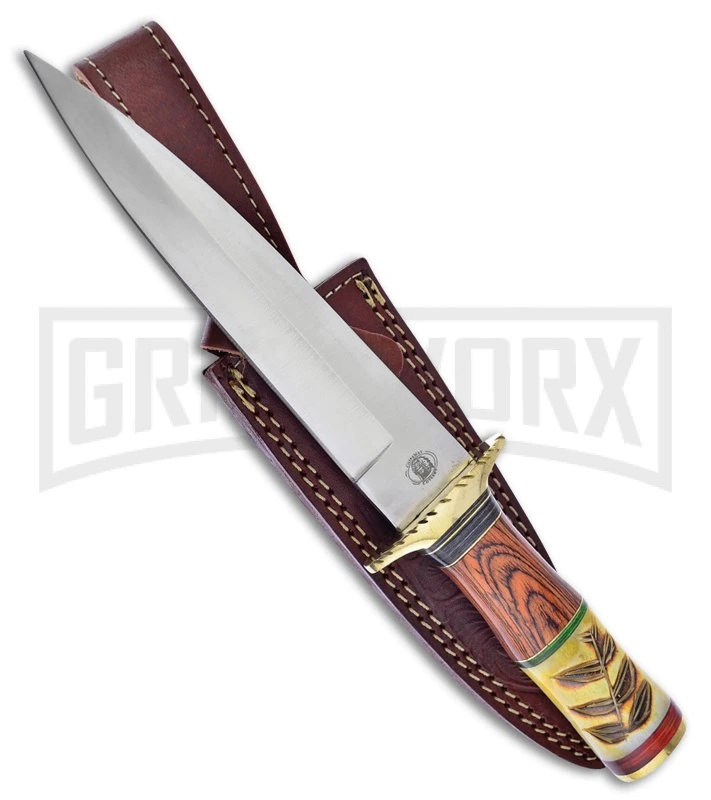 The Frost Cutlery Colorado City Dirk is a fixed blade knife for hunting. The stainless steel, drop blade has a satin finish. The handle is made of natural bone and brown wood with pakkawood spacers. It also has a brass guard and pommel. It comes with a brown leather belt sheath.