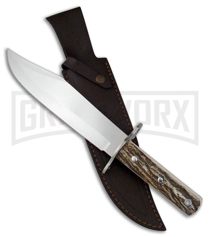 The Frost Cutlery Hen & Rooster Grizzly Bowie is a fixed blade knife for hunting. The full tang stainless steel, clip point blade has a mirror finish. The handle is made of stag antler with a stainless steel guard. It has a lanyard hole and comes with a brown leather belt sheath.