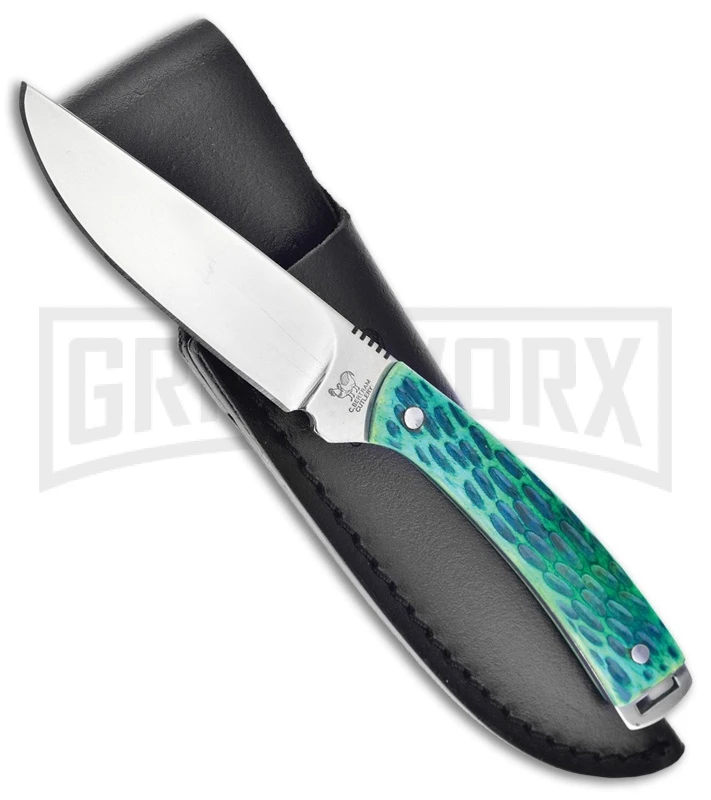 The Frost Cutlery Hen & Rooster Small Hunter is a fixed blade knife for hunting. The extended tang 440 stainless steel, drop point blade has a mirror finish. The handle is made of green jigged bone that features a lanyard hole. It comes with a black leather belt sheath.
