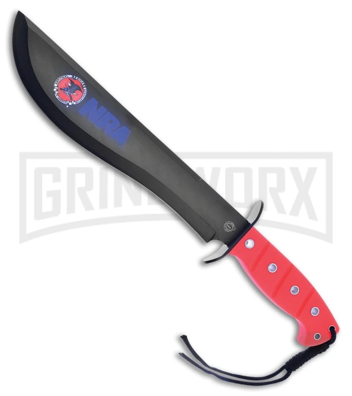 The Frost Cutlery NRA Quicksilver Bowie is a fixed blade knife for that next camping experience. The stainless steel, bolo blade has a black finish and NRA logo artwork. The handle is made of red rubber, and features a lanyard hole. A black nylon belt sheath is included.