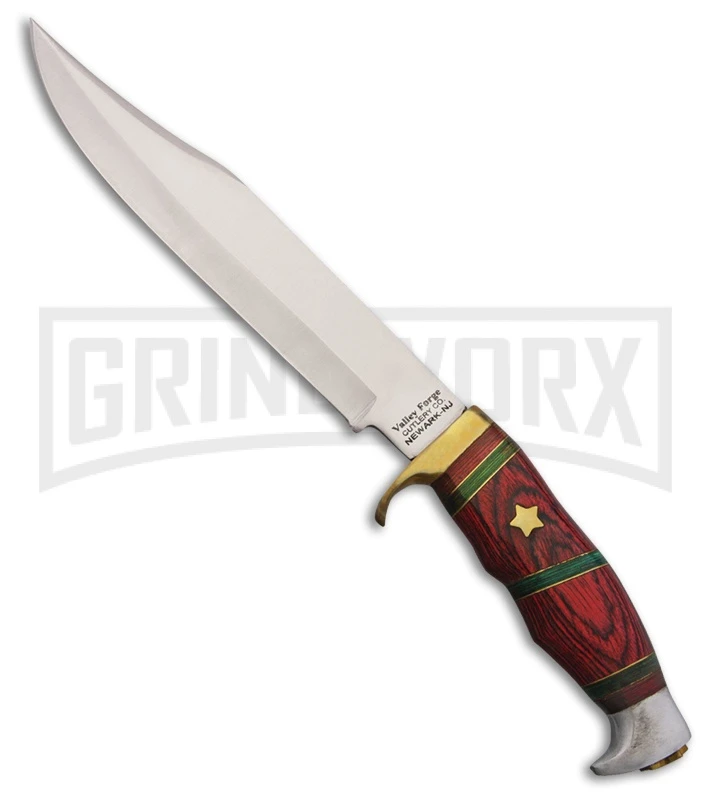 The Frost Cutlery Valley Forge Bowie is a fixed blade knife and is great for hunting because the blade length gives the hunter a lot of cutting power for skinning and cleaning. This bowie blade is satin finished stainless steel. The handle is brown pakkawood with a brass star inlay, brass finger guard, and a stainless steel pommel. It also comes with a brown leather belt sheath.