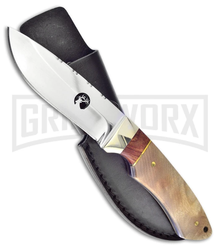 The Frost Cutlery Whitetail Transparent Snare is a fixed blade knife for hunting. The stainless steel, drop point blade has a mirror finish. The handle is made of burl wood that features a nickel silver bolster and a lanyard hole. It comes with a brown leather belt sheath.