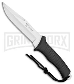 The Hen & Rooster Sport Hunter is a fixed blade knife for hunting. The stainless steel, spear point blade has a satin finish. The handle is made of black rubber over an extended tang. It has a lanyard hole, lanyard, and comes with a black leather belt sheath.