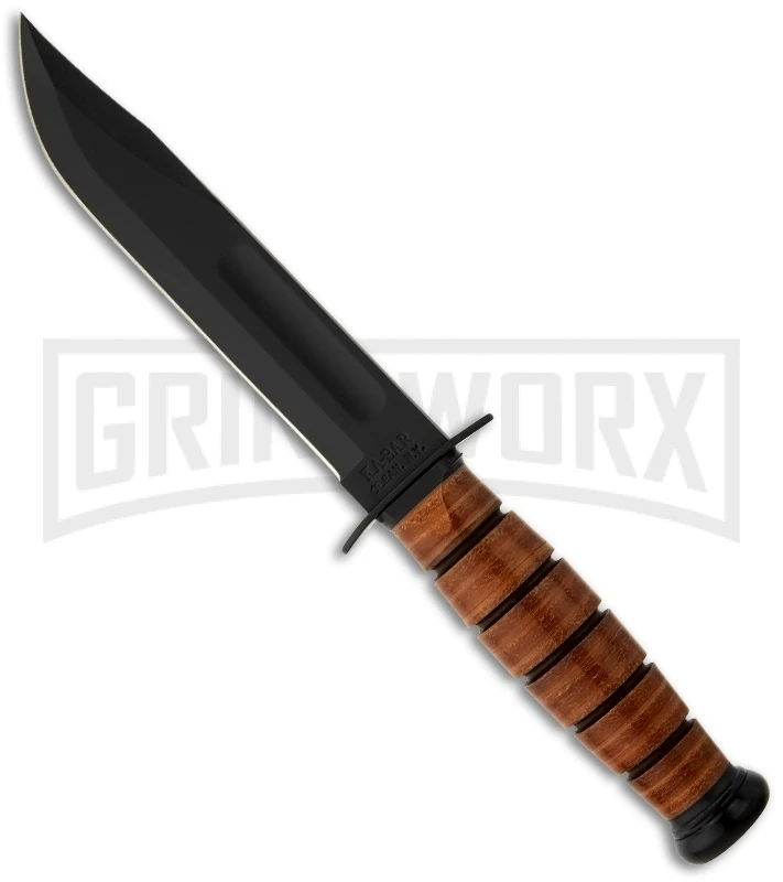 The Short Ka-Bar USA is three-quarters the size of the original. Features Ka-Bar’s famous oval shaped leather handles, the Short KA-BAR version of the traditional KA-BAR is made just as well as the original. This is the same knife design used by the armed forces in World War II just scaled down. The blade is black coated 1095 Cro-Van steel with partial serrations. This knife comes with a leather sheath.