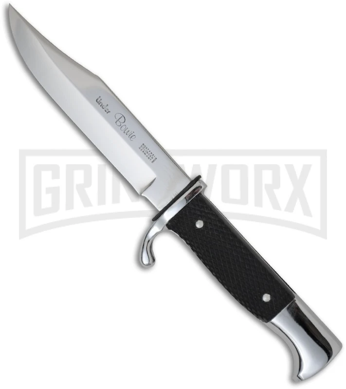 The steel blade has a polished mirror finish, clip point blade. One side of the blade has the Rehwappen signet and the reverse says “Original Bowie Knife” in beautiful Blackletter calligraphy. The cocobolo wood handle has finger grooves on the belly with a stainless front quillon and pommel.