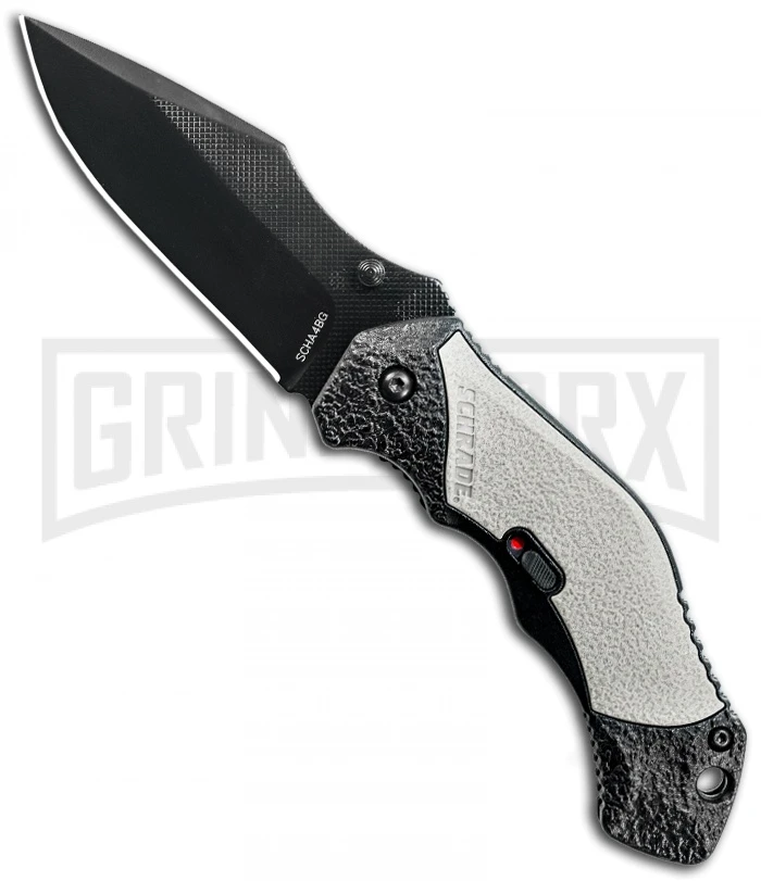 The SCHA4BG knife has a black aluminum handle with gray rubber insert. Liner lock frame, side safety and pocket clip. Black finished 4034 stainless steel clip point blade with a plain edge.