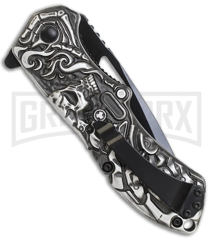 The Schrade Lazy Bones knife from the Boneyard Series features MAGIC assisted opening action and a bone themed handle design. It has a black finished AUS-8 blade with ample jimping for secure use. The decorative aluminum scales are come fitted with a sliding safety lock and a tip-down stainless steel pocket clip.
