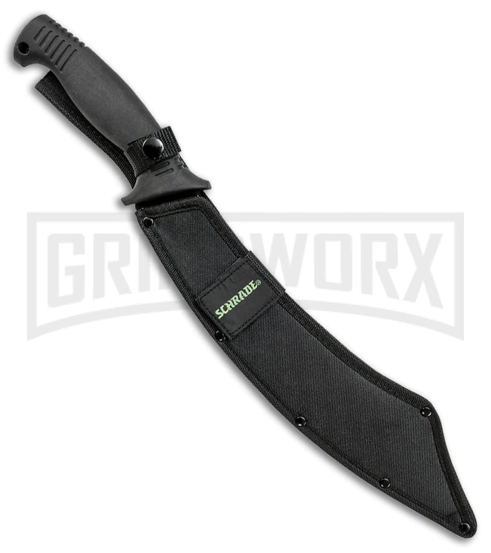 The Schrade Mach1 Machete has a stainless steel blade with a durable black finish and a satin grind. It’s outfitted with a large flat-ground blade that was designed to make light work of any outdoor cutting chore. The Schrade Mach1 includes a heavy duty nylon sheath with a belt loop.