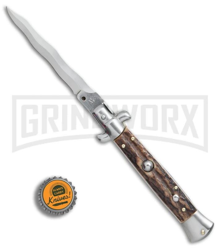 SKM AB 9″ Italian Stiletto Stag Automatic Knife – Kris Satin Plain