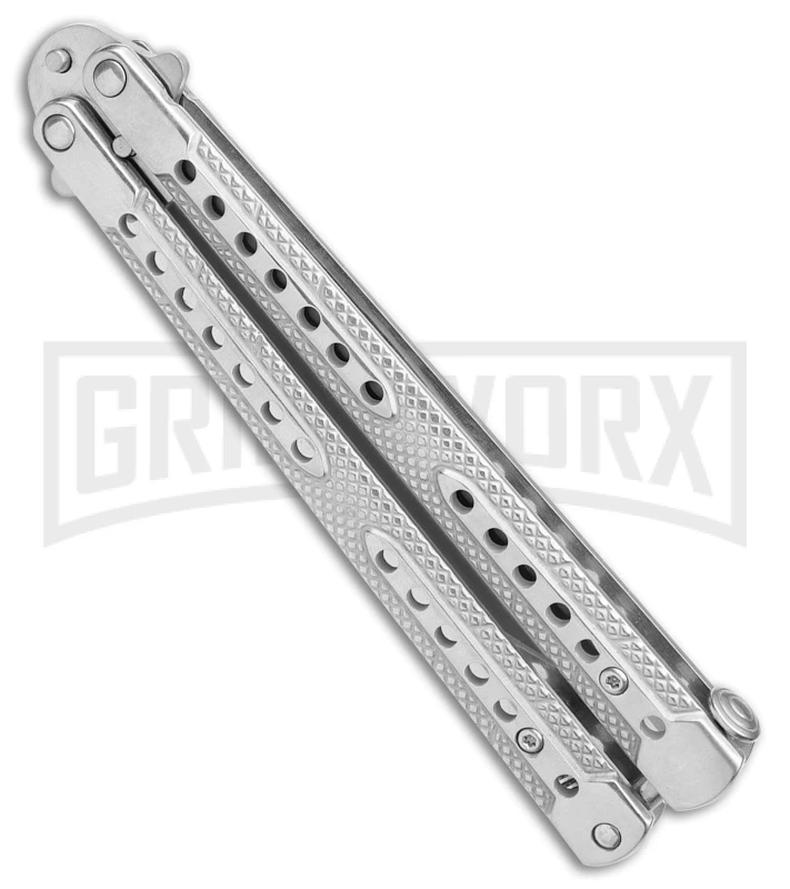 This Swift balisong is built with a silver-finished blade and silver handles.