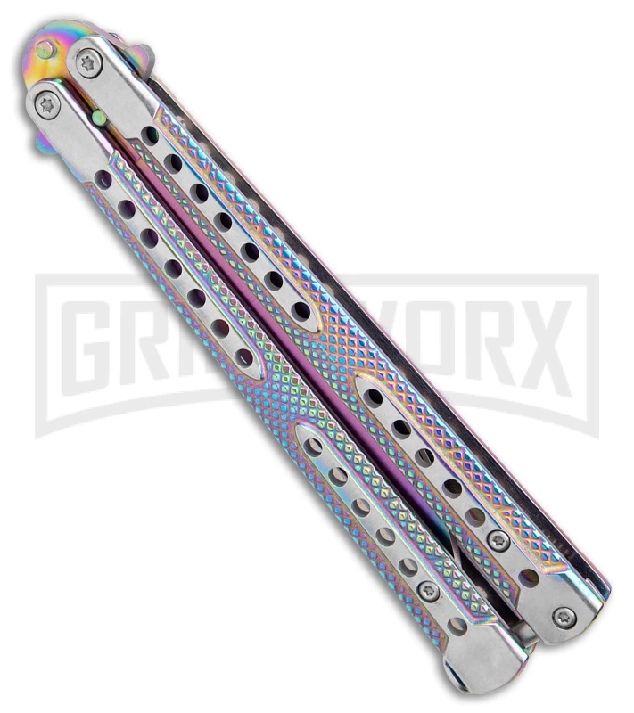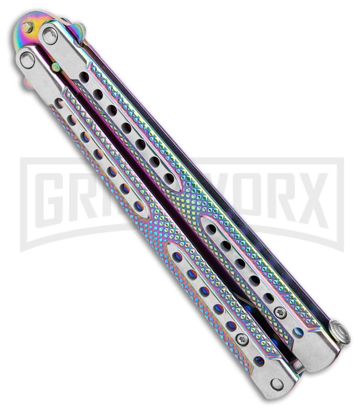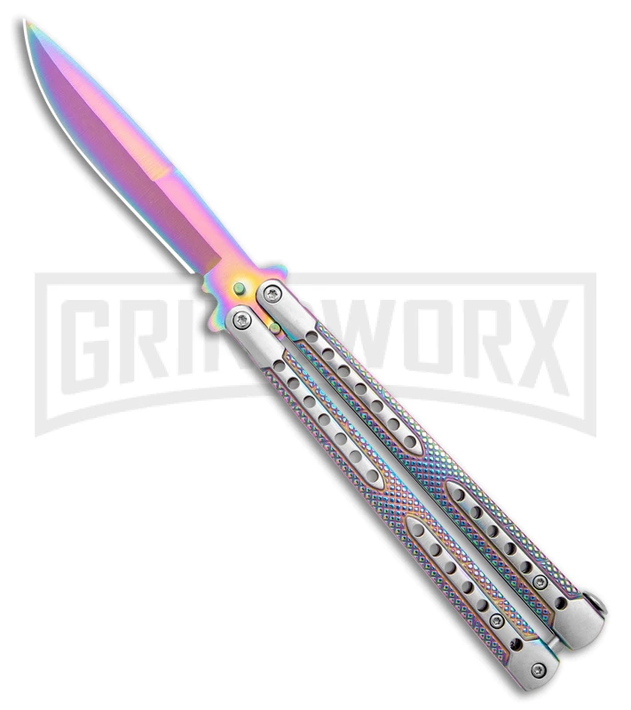 This Swift balisong is built with a rainbow-finished blade and silver and rainbow handles.