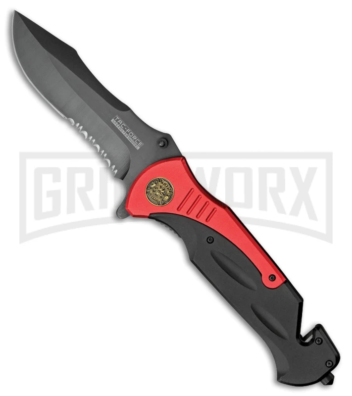 The Tac-Force Speedster Congo is a spring assisted knife for rescue. If you haven’t considered a rescue knife it may be time to do so. With all the talk surrounding other types of knives the rescue speedsters have their own epic uses and could very well save your life or the life of someone you love one day. The black stainless steel clip point blade, has a partially serrated blade with dual thumb studs and flipper. The red and black anodized aluminum handles, feature an integrated seat belt cutter, glass breaker, Fire Department shield, and a liner lock mechanism. The item also has a black finish pocket clip.