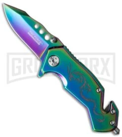 This flashy spring assisted knife from Tac-Force is a well constructed everyday carry knife that showcases a stylishly designed look. Spectrum colored steel makes up the blade and handle, and an impressive dragon graphic covers the presentation side of the knife handle. The blade is made from 440 stainless steel and has a modified drop point design that adds a unique touch to the blade. Cool features of this knife include a strap cutter, glass breaker, dual thumb studs, and a tip-down carry pocket clip. The small size and light weight make the knife very easy to carry in your pocket. You’ll have a hard time finding another knife in this size or price range with all of these great knife features.