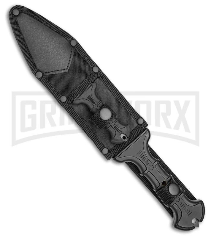 The United Cutlery Commander Gladius is a set of two gladiator daggers. The knives are black finished, 1065 carbon steel, double-edged dagger blades. The handles are made of black rubberized FRN with a lanyard hole and integrated glass breaker. A black nylon belt sheath carries both knives.