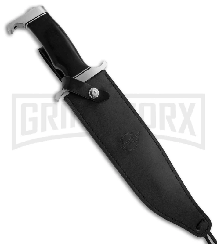 The Gil Hibben Survivor Bowie knife from United Cutlery is the ultimate jungle warrior. It features a massive razor-sharp stainless steel blade with powerful sawback teeth, black pakkawood handle, and a hefty hand guard to protect your hand from slipping to the blade. Lashing holes are pre-drilled in the guard and pommel to allow for spear making by lashing the knife to a long, wooden handle. Includes a custom leather belt sheath and a certificate of authenticity.