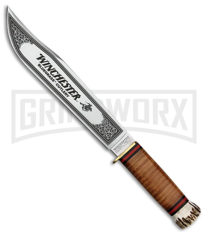 The Winchester Explorer is a collectible fixed blade knife that will look awesome hanging in your man cave. The clip point blade is mirror finished with “Winchester Bluegrass Cutlery” etching. The handle is stacked brown leather with a brass finger guard and stag pommel. This knife comes with a protective brown leather belt sheath.